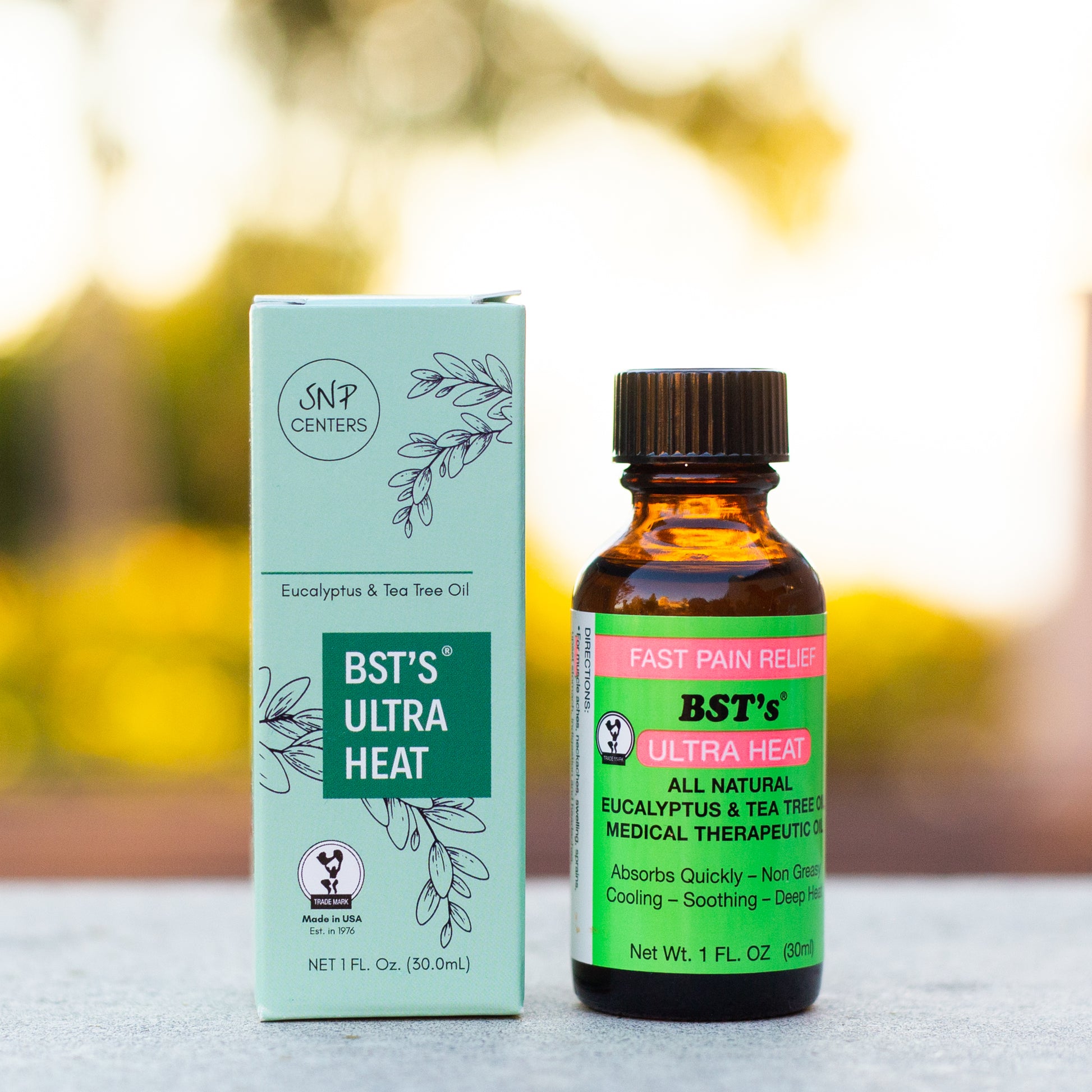 BST's Ultra Heat is second oil formulation in the BST line, combining the medicinal properties of eucalyptus and tea tree essential oils. The benefits of Tea Tree Oil have been well-documented, including its anti-bacterial, anti-fungal, and anti-viral effects. Bottled and packaged in California.